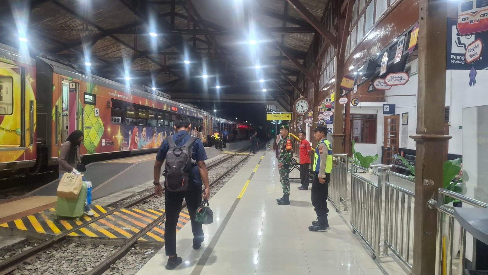 *BLORA* – Personel Polsek Cepu bersama unsur TNI dan petugas keamanan internal menggelar pengamanan intensif di Stasiun KAI Cepu, Kelurahan Balun, Rabu (25/03/2026) malam. Langkah ini dilakukan untuk menjamin keamanan dan kenyamanan penumpang pada jam keberangkatan maupun kedatangan kereta api jalur lintas utara. Fokus pengamanan meliputi pemantauan arus penumpang serta sterilisasi area peron saat kedatangan KA Pandalungan, KA Sembrani tujuan Jakarta, hingga kedatangan KA Blora Jaya dan KA Blora Sura. Selain itu, petugas juga mengawal keberangkatan KA Kertajaya yang melayani rute Surabaya menuju Stasiun Pasar Senen, Jakarta. Kapolsek Cepu, AKP Edi Santosa, S.H., M.H., menegaskan bahwa kehadiran anggota Polri di objek vital seperti stasiun merupakan upaya preventif untuk mengantisipasi tindak kriminalitas serta memastikan pelayanan publik berjalan tanpa gangguan. "Kami menempatkan personel untuk bersinergi dengan Koramil dan Security Stasiun guna memantau pergerakan penumpang. Fokus kami adalah memastikan situasi tetap kondusif, terutama pada jam-jam sibuk keberangkatan kereta api jarak jauh," tegas AKP Edi Santosa. Hingga kegiatan berakhir, situasi di area Stasiun Cepu dilaporkan terpantau aman, lancar, dan terkendali. Tidak ditemukan adanya gangguan kamtibmas yang menonjol, sehingga aktivitas masyarakat di sektor transportasi kereta api tetap berjalan normal.
