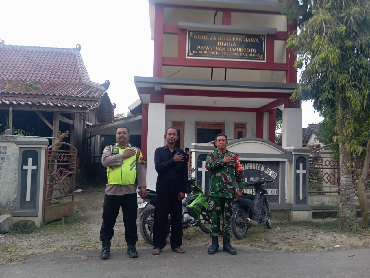*BLORA* – Personel Bhabinkamtibmas Polsek Jepon Polres Blora bersama Babinsa Koramil Jepon melakukan pengamanan serta monitoring kegiatan ibadah Sabtu Sunyi di Gereja GKJ Pepanthan Sumurboto, Kecamatan Jepon, Kabupaten Blora, Sabtu (04/04/2026) sore.